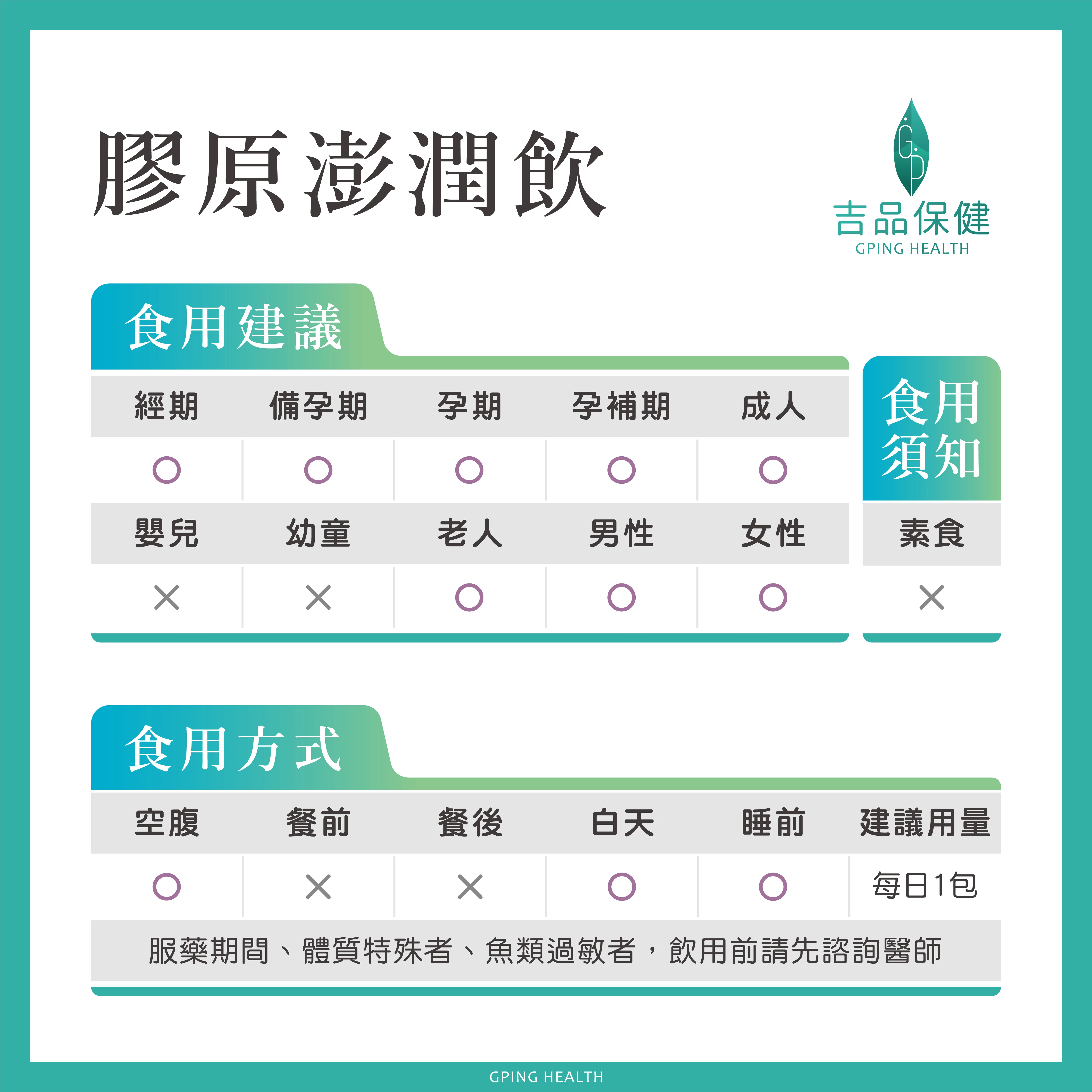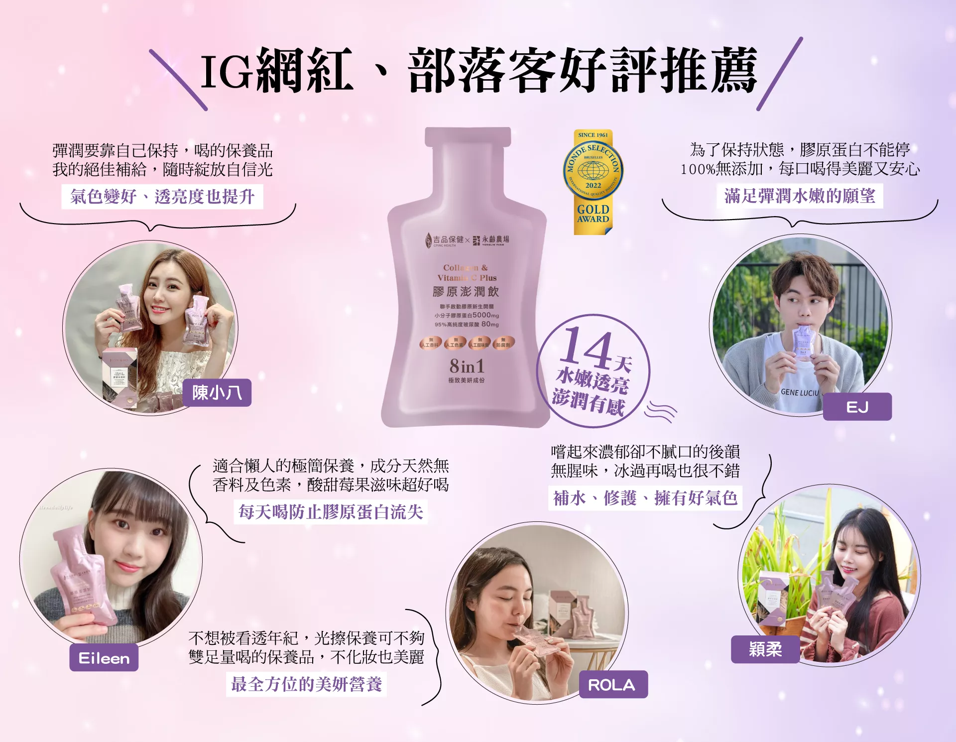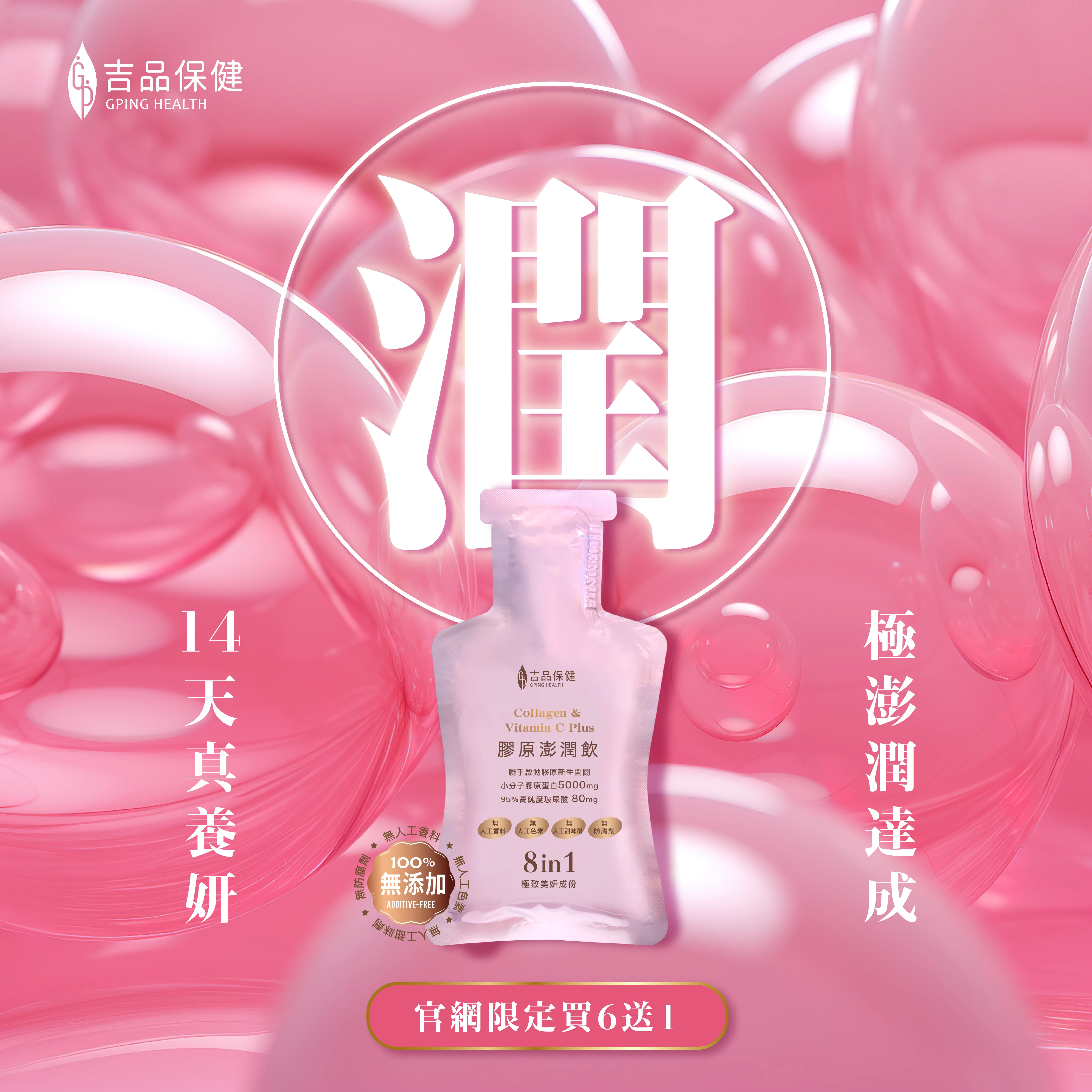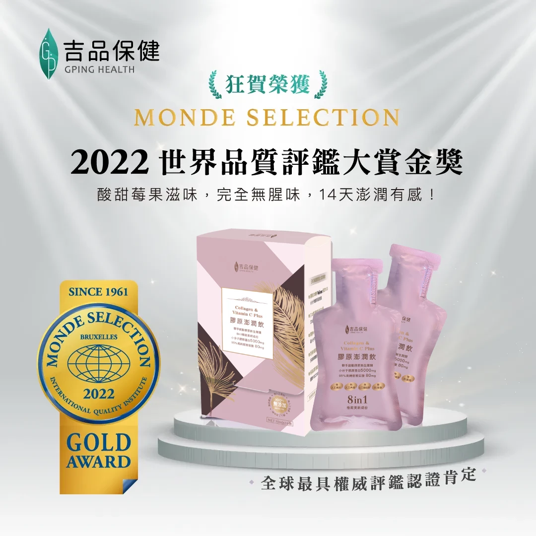 吉品保健膠原澎潤飲,榮獲2022年Monde Selection®世界品質評鑑大賞金獎,市售唯一雙足量添加,每包含5000mg日本新田膠原蛋白與98%高純度玻尿酸80mg,搭配卡姆果萃取維生素C 300mg,幫助維持澎潤水嫩的肌膚感受,讓您輕鬆喝出青春活力。適合日常保養或特別場合前的快速調整。