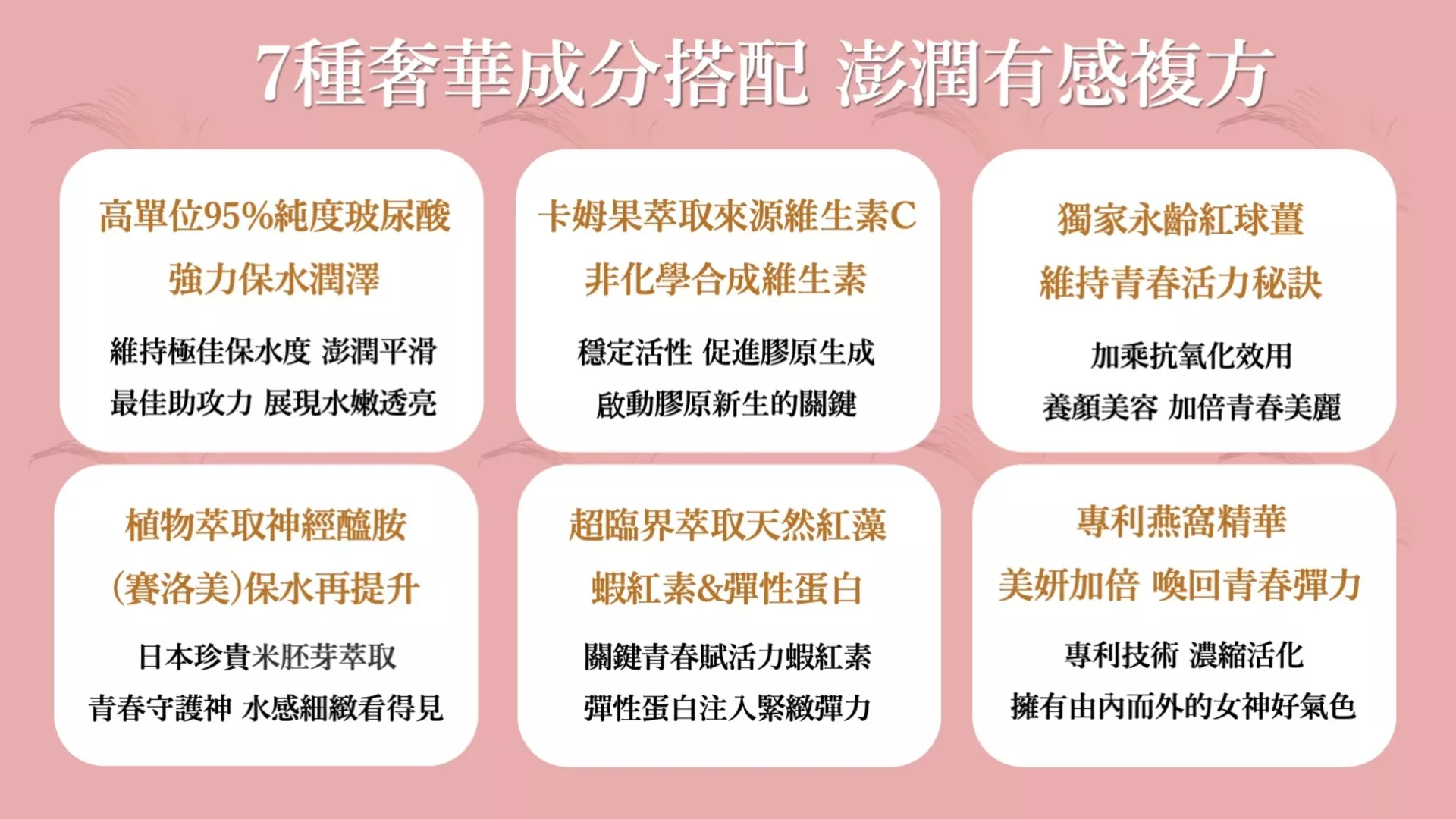 - 8in1極致美容成分:神經醯胺、專利燕窩精華、紅球薑等成分,提供全方位的保養體驗