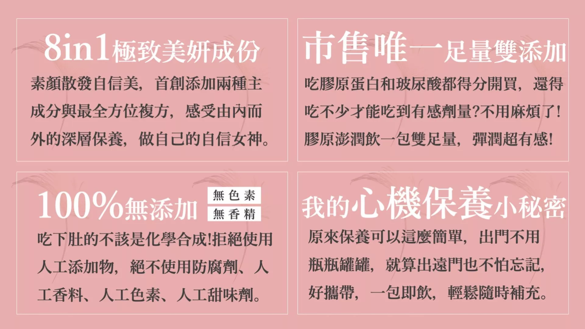 - 卡姆果萃取維生素C 300mg:提升膠原蛋白的吸收,與膠原蛋白及玻尿酸形成澎潤金三角